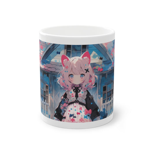 Anime Tasse mit süßem Catgirl vor blauem Haus