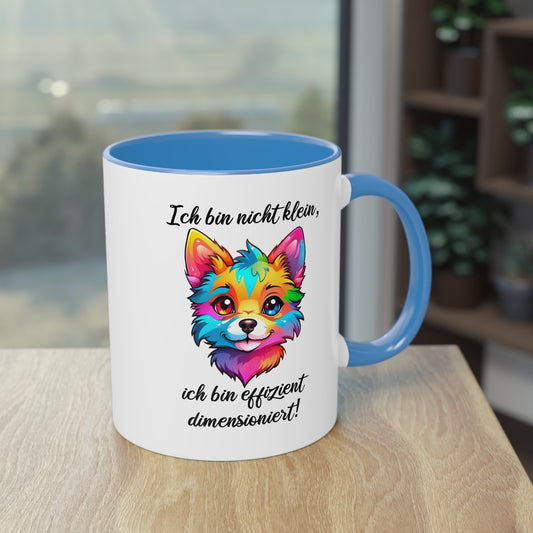 Tasse „Ich bin nicht klein, ich bin effizient dimensioniert“ mit buntem Fuchsdesign