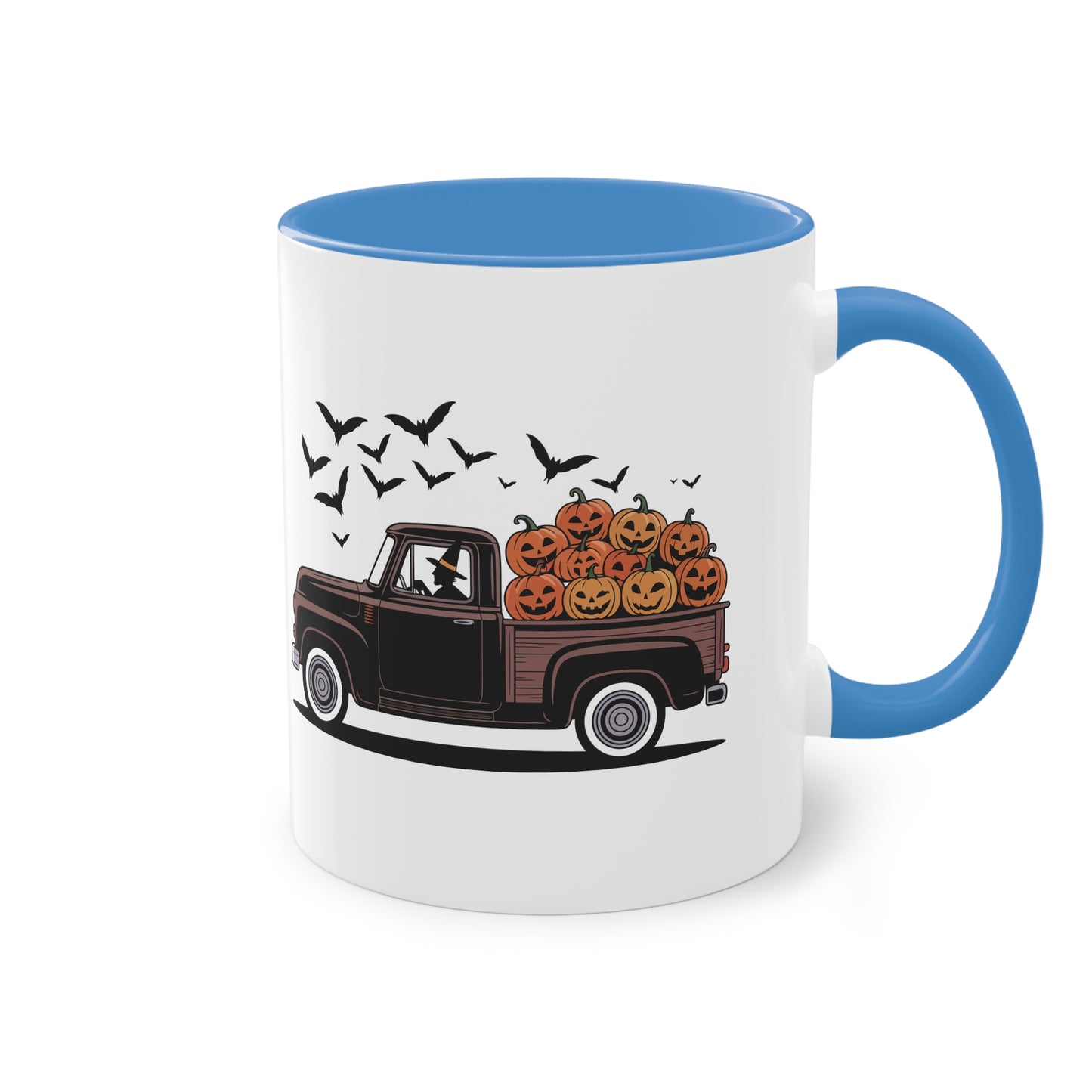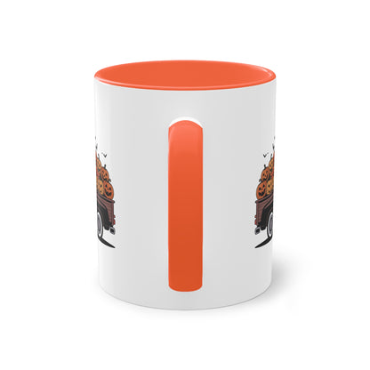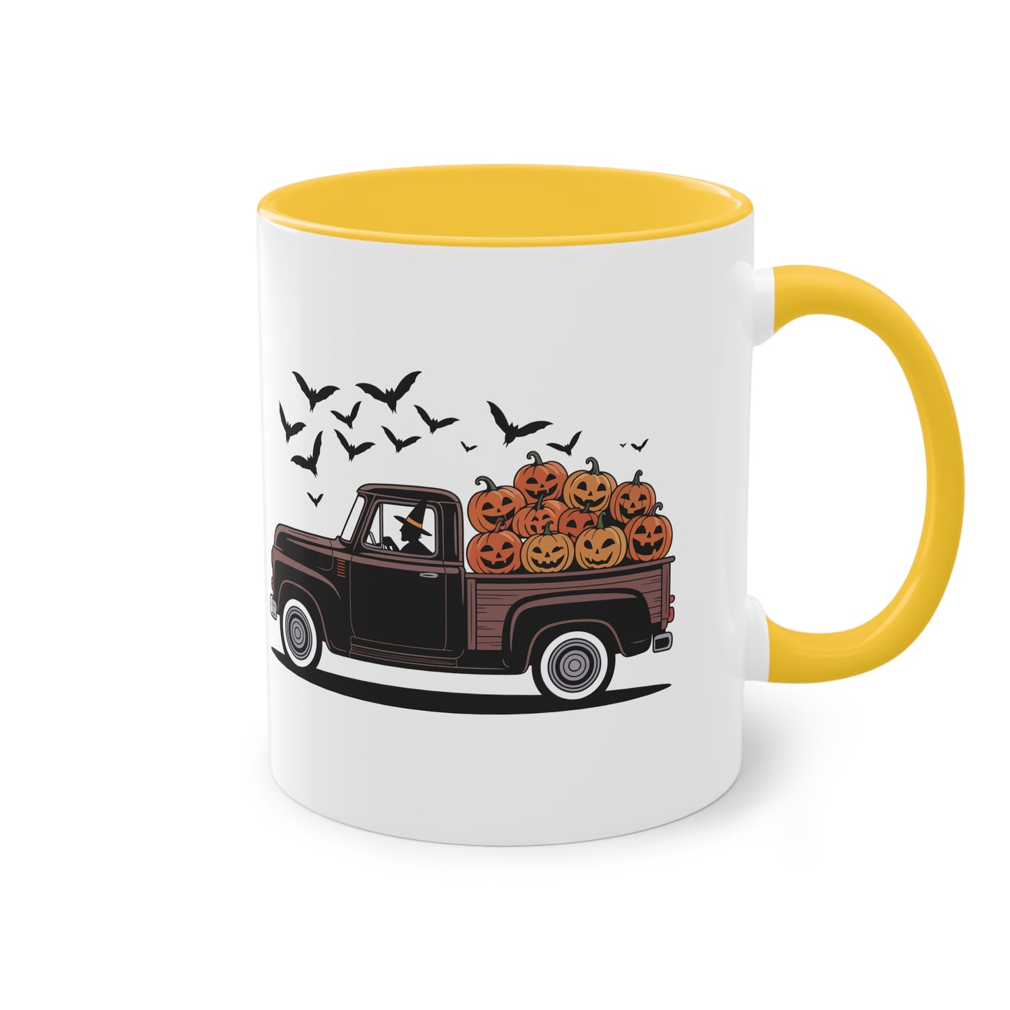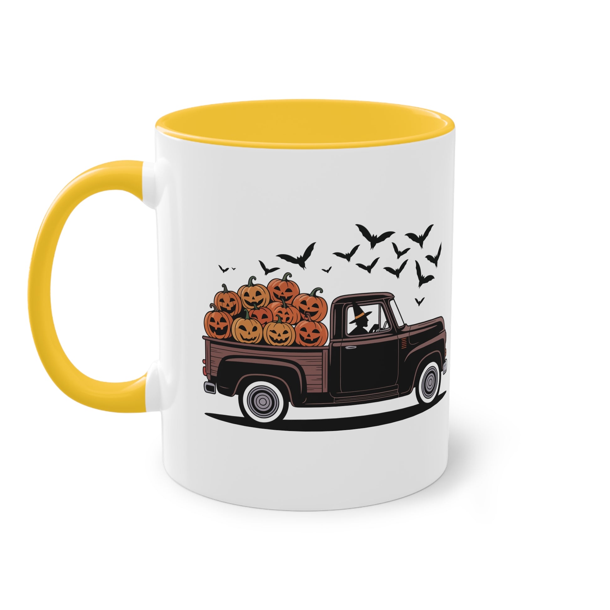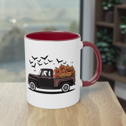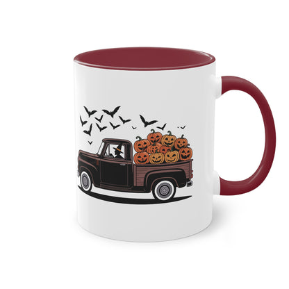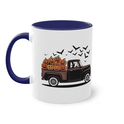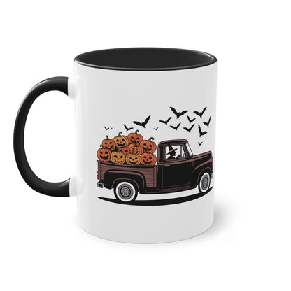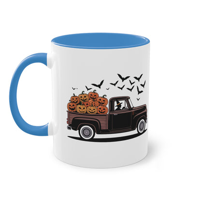 Halloween Tasse mit Hexe im Truck und Kürbisladung