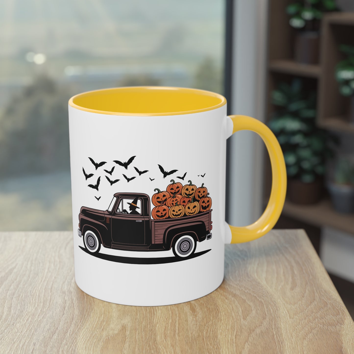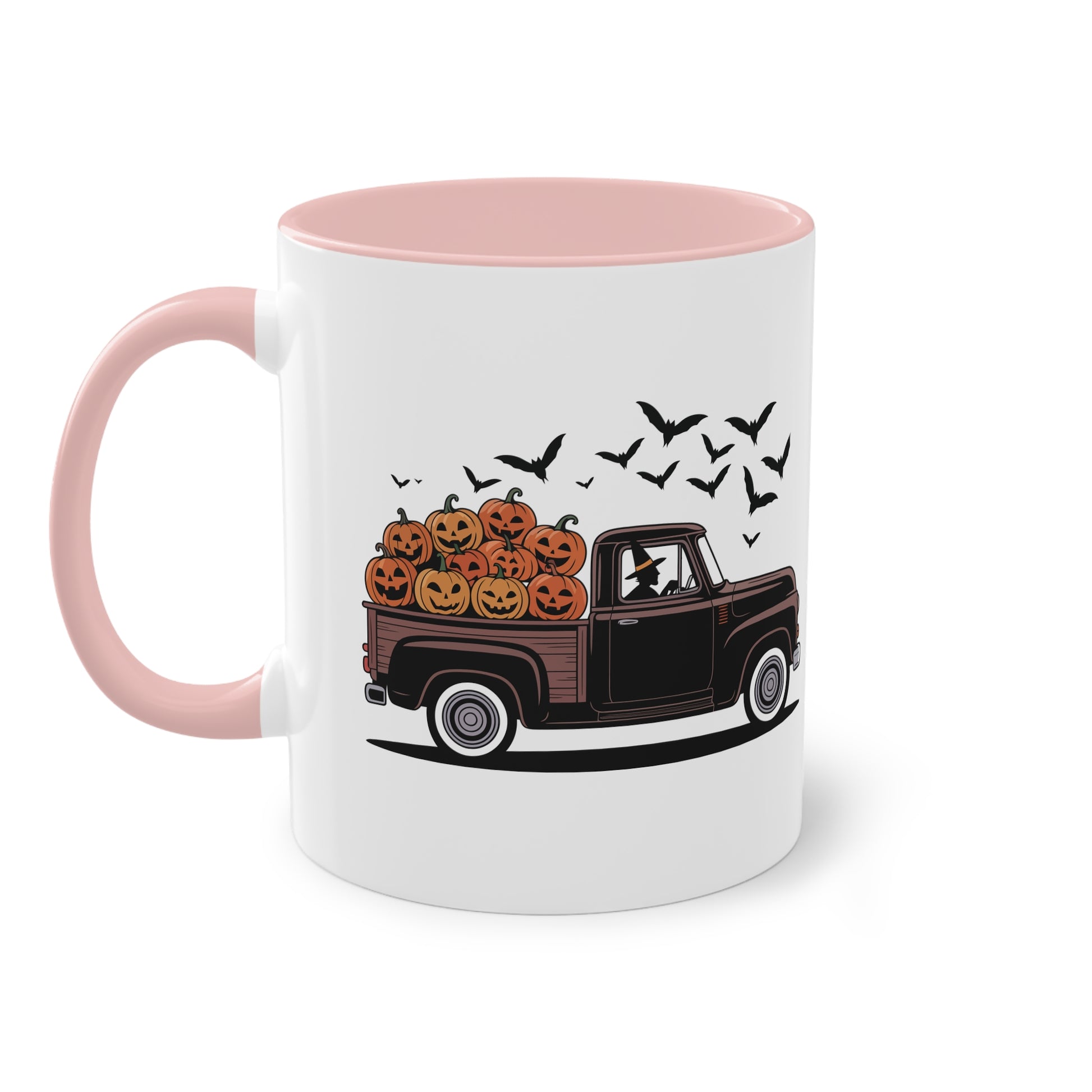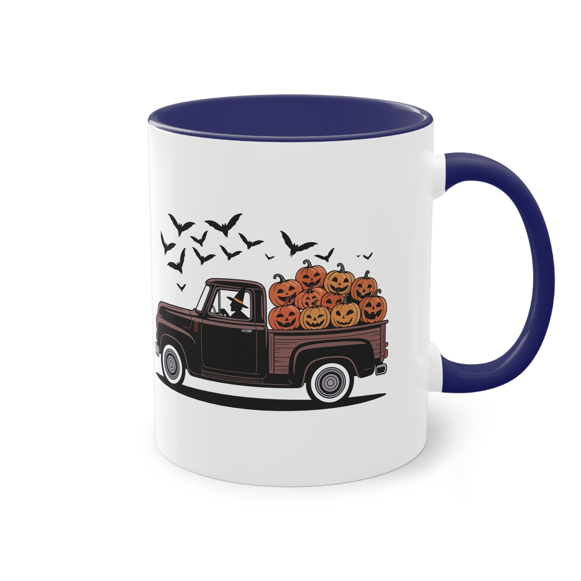 Halloween Tasse mit Hexe im Truck und Kürbisladung