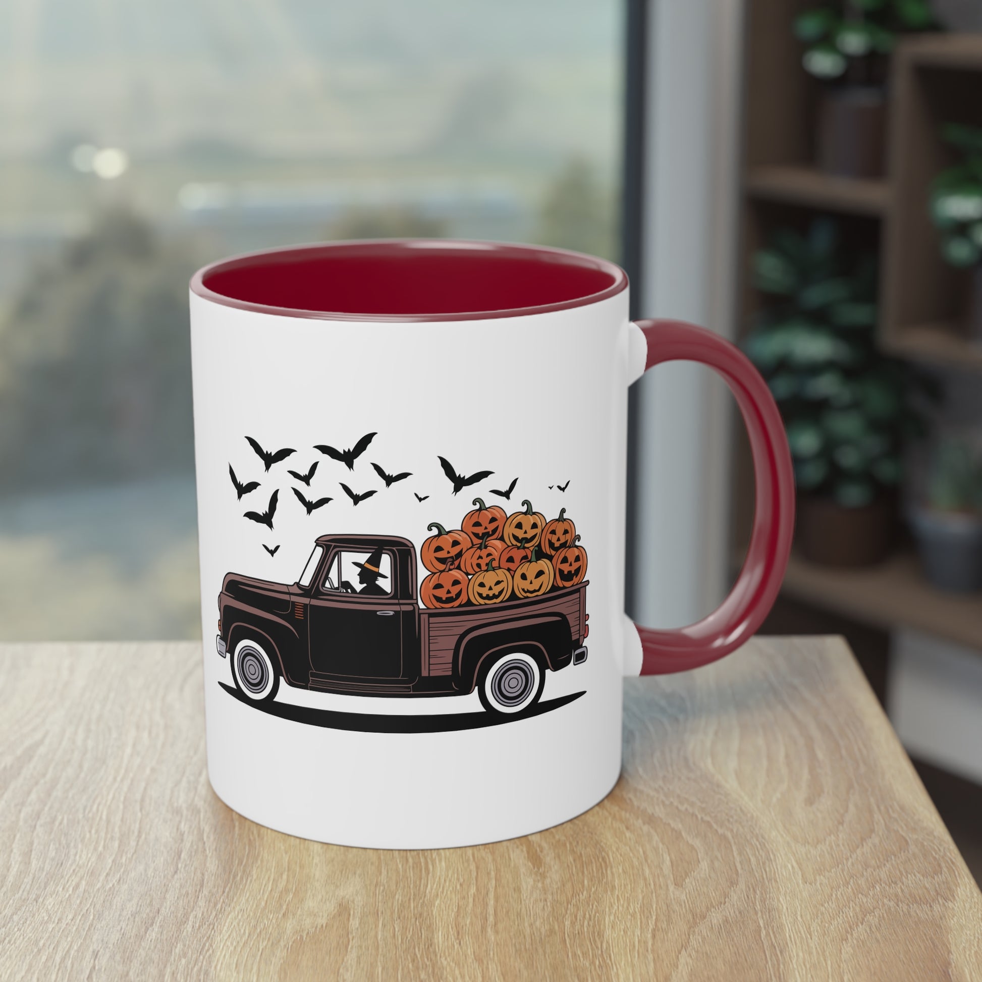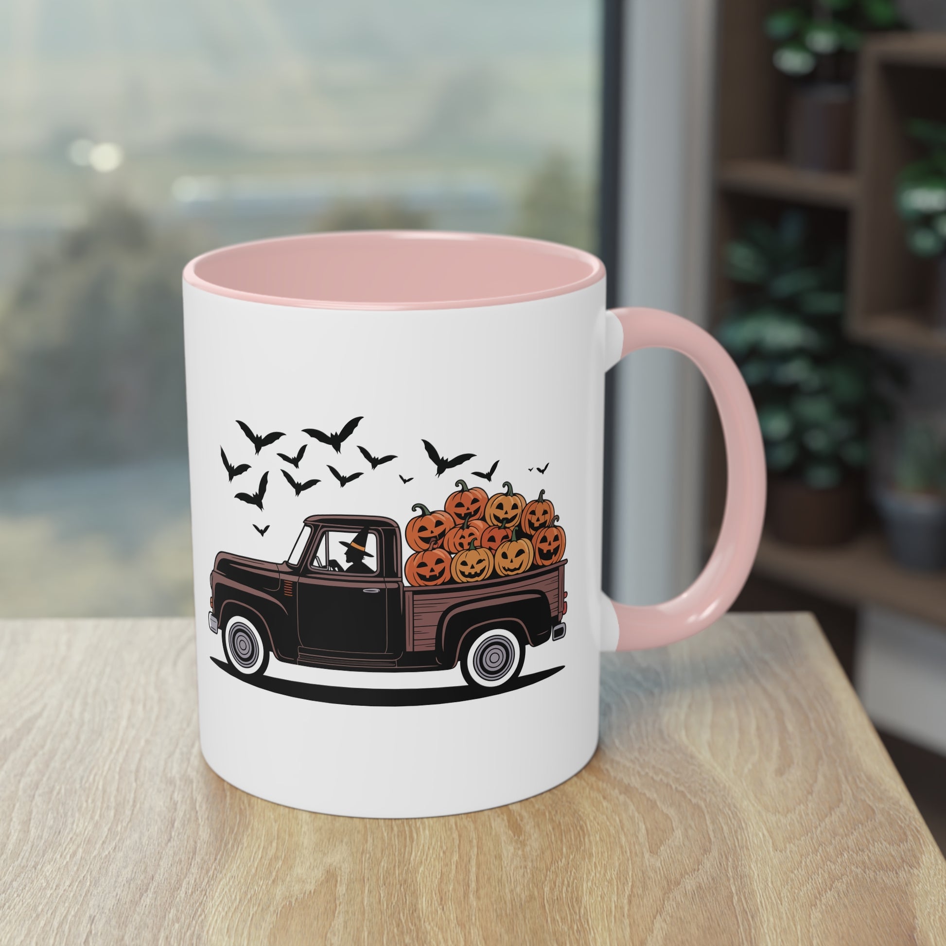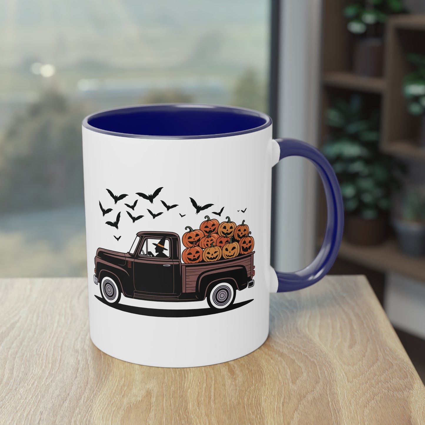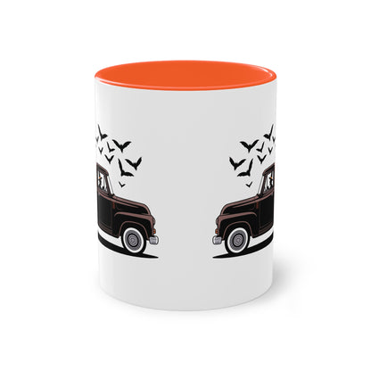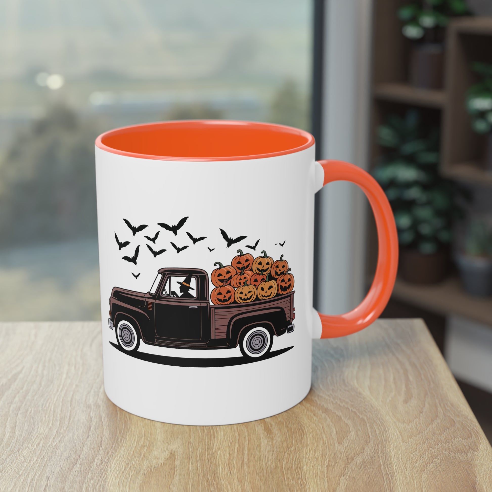 Halloween Tasse mit Hexe im Truck und Kürbisladung