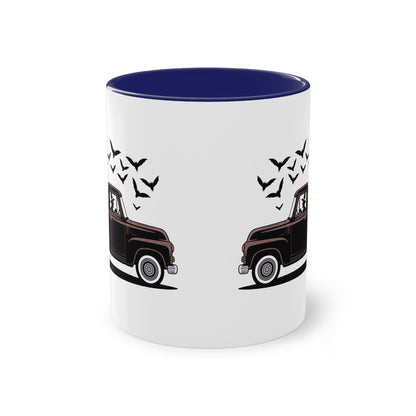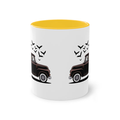 Diese Tasse bringt echtes Halloween-Feeling auf den Frühstückstisch: Eine geheimnisvolle Hexe fährt im Oldtimer vor, auf der Ladefläche stapeln sich grinsende Kürbisse. Über dem Truck kreisen schwarze Fledermäuse ein perfektes Motiv für alle, die den Herbst lieben.